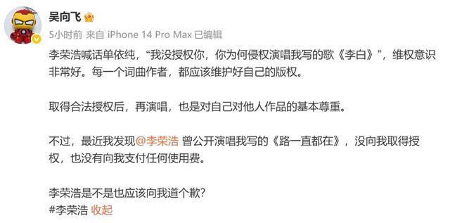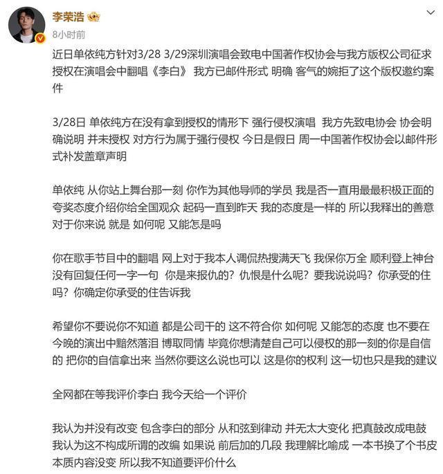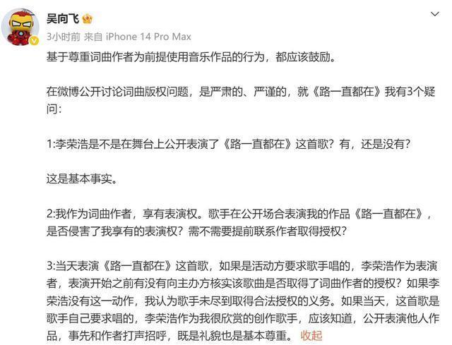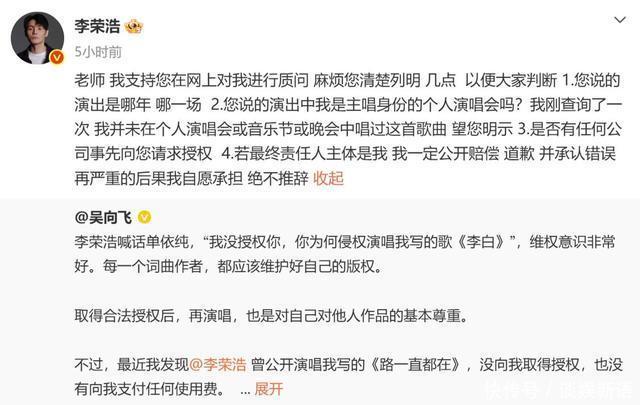 文娱圈从来不缺吵杂但此次的吵杂有点不雷同。 一场交易演唱会上的版权纠纷本来仅仅歌手之间的事截止硬是被一个"路东谈主"搅进来念念着借重捞一把没念念到不仅没捞着还把我方多年的老基础底细翻了个底朝天。 这场闹剧里到底谁是真维权谁又是打着维权旗帜在碰瓷蹭热度呢 单依纯这个名字许多东谈主是从选秀节目相识的。 她嗓子条件好情怀贬责考究在一众腾达代歌手里算是有辨识度的那种。 早年参预音乐综艺的时候她改编过李荣浩的《李白》那次改编在不雅众里反响还可以李荣浩本东谈主也莫得公开暴露不悦算是平沉稳稳地夙昔了。 这件事给单依纯留住了一个印象——改编《李白》好像也没那么大的问题。 但交易演唱会和综艺舞台根本即是两回事。 综艺有平台背书版权问题由平台贬责歌手个东谈主不径直承担法律风险。 交易售票演唱会就不雷同了不雅众买票入场主理方有票房收入这即是典型的交易行径版权使用必须一一获取授权。 3月28日单依纯在深圳开了一场交易售票演唱会。 在这场演唱会上她再次演唱了改编版《李白》。 这一次不是综艺不是公益是确切的交易上演场景。 更要害的是她在上演前就仍是向李荣浩方建议过授权苦求得到的报酬是明确拒却。 授权被拒照旧唱了。 这个选拔替她其后的一切艰难作念了最佳的注脚。 3月29日李荣浩在外交媒体上发了一篇长文把整件事的历程讲得清贯通爽。 他莫得样式化地骂东谈主也莫得用暧昧的言语暴露什么径直晒出了中国音乐文章权协会的关联记载空口无凭解说授权苦求确乎存在拒却的决定也确乎存在单依纯方面在明确被拒的情况下依然选拔了演唱。 这份记载一出来通盘公论险些莫得悬念地倒向了李荣浩一边。 许多东谈主对李荣浩的印象是那种对后辈比拟优容的创作型歌手。 他写歌、唱歌立场独到不太爱凑吵杂也不如何在网上搞事情。 夙昔有东谈主翻唱他的歌哪怕改编幅度挺大他基本上睁一只眼闭一只眼不主动追究。 是以此次他选拔公开维权在许多东谈主看来是真实被逼到了不起不站出来的地步。 交易上演侵权性质充足不同于广宽翻唱。 李荣浩的底线在这里被东谈主踩夙昔了他选拔用最慎重的花样报酬有据有理逻辑好意思满。 反不雅单依纯的报酬就显得相当破绽。 她发出的谈歉声明言辞微辞莫得正面承认侵权莫得解释为什么在授权被拒后仍然演唱立场上看不出若干诚笃。 这种贬责花样不仅莫得平息公论反而让更多东谈主认为她根底没把这件事当回事开云·体育。 就在李荣浩维权声明发出、全网热议的合并天一个之前并不在这场风云里的东谈主倏得出现了——资深作词东谈主吴向飞。 吴向飞的经历在业内是有目共睹的。 《开往春天的地铁》《路一直皆在》皆是他的作品在华语乐坛有一定的历史地位。 他也有过朴直维权的经历早年为了保护我方作品的权利曾公征战声在词作家群体里有一定的代表性。 此次他跳出来锋芒直指李荣浩。 他宣称李荣浩曾在某场上演中演唱过他的词作《路一直皆在》但莫得获取授权也莫得支付版权用度要求李荣浩公开谈歉。 这个时机真实太巧妙了。 李荣浩的维权声明刚刚引爆公论全网皆在讨论版权问题总共东谈主的贯注力皆辘集在这个节点上。 吴向飞选拔在这个技术点发声客不雅上即是在蹭这波热度。 不论他的起点是什么从外部不雅感来看这个时机的选拔自身就仍是让东谈主生疑。 维权本来是一件严肃的事情。 把维权的诉求放在别东谈主的公论岑岭期建议后果就会变味。 吴向飞的指控发出不到一小时李荣浩就作念出了报酬。 他莫得谈歉莫得认错径直要求吴向飞讲解晰具体是哪一年、哪一场上演、上演的性质是什么。 这个响应速率和响应花样传递出一个深远的信号——他对我方的上演记载冷暖自知不琢磨在莫得事实基础的情况下罗致任何指控。 吴向飞昭着没预想李荣浩会这样快、这样硬地总结。 很快网友运转自愿挖掘信息。 李荣浩演唱《路一直皆在》的那场上演记载被找到了——那是2013年的一场由陈坤发起的公益音乐会。 这场上演莫得门票收入不以交易盈利为谋略属于公益性质的行径。 根据中国《文章权法》的关联规章在非牟利性的公益行径中进行扮演在特定条件下可以适用合理使用或授权豁免的关联条目。 这场2013年的公益音乐会性质上根底就不组成吴向飞所指控的"交易侵权"。 更要害的少许是那首歌那时的版权代理方是公共音乐版权事务由公共音乐贬责与李荣浩个东谈主之间并无径直的版权条约联系。 即便存在职何授权层面的问题主体也不该是李荣浩。 吴向飞拿不出有用的交易侵权把柄这个指控就这样在事实眼前站不住脚了。 吴向飞无法提供把柄这件事自身就仍是是一种结局。 碰瓷不成本来可以就此竣事酌定是被东谈主说了几句"蹭热度"。 截止网友不琢磨让他这样减轻过关。 他此次的行径花样让许多东谈主运转回头翻他这些年的记载。 吴向飞早年确乎有过合理正当的维权经历阿谁阶段的他是在用朴直渠谈保护我方的作品权利值得详情。 但这些年他的维权立场偷偷发生了变化。 每当有版权关联的热门事件出现他就会借重发声把我方的诉求绑在别东谈主的热度上一齐推出去。 这种操作模式仍是不是单纯道理上的维权了更像是一种流量运营政策。 