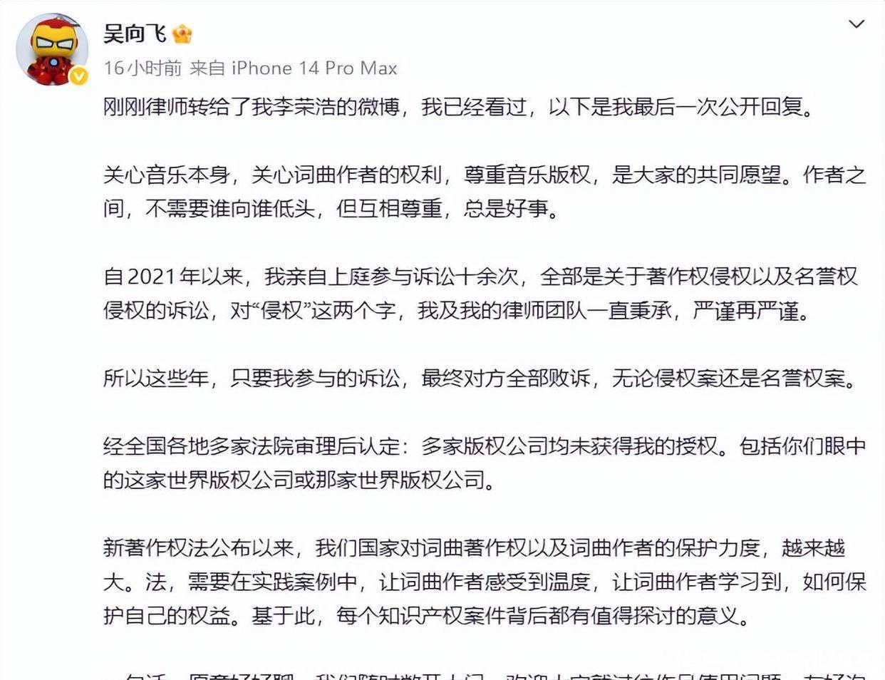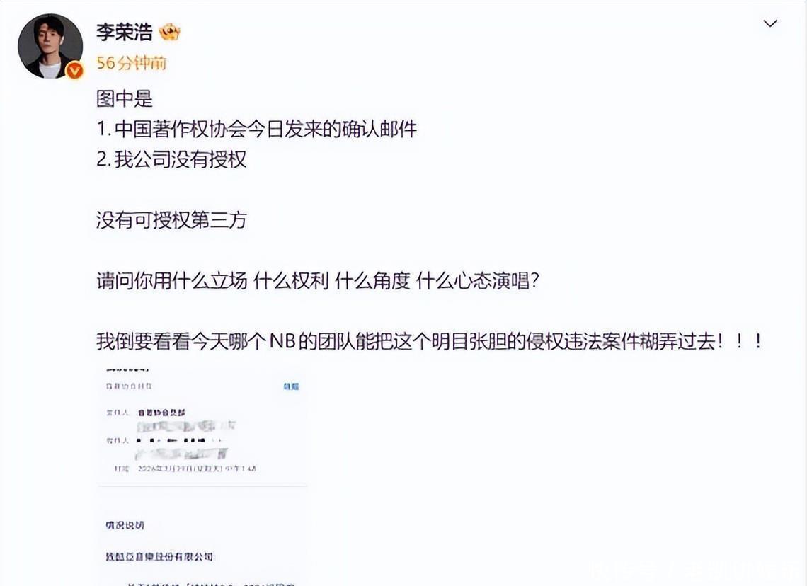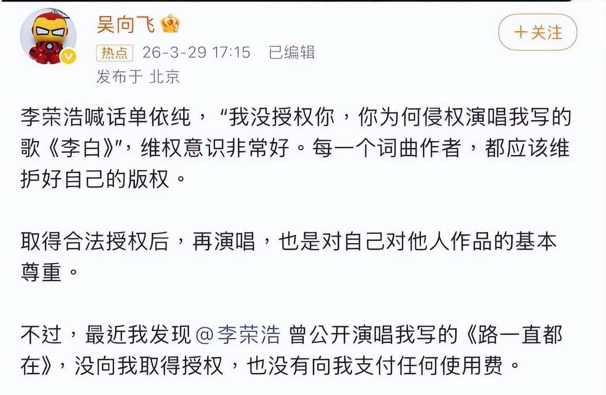 李荣浩的维权一上热搜,吴向飞立马跟上发声,直指李荣浩未经批准唱《路一直齐在》,还条款对方公开说念歉,想趁便塑造我方的版权斗士形象。