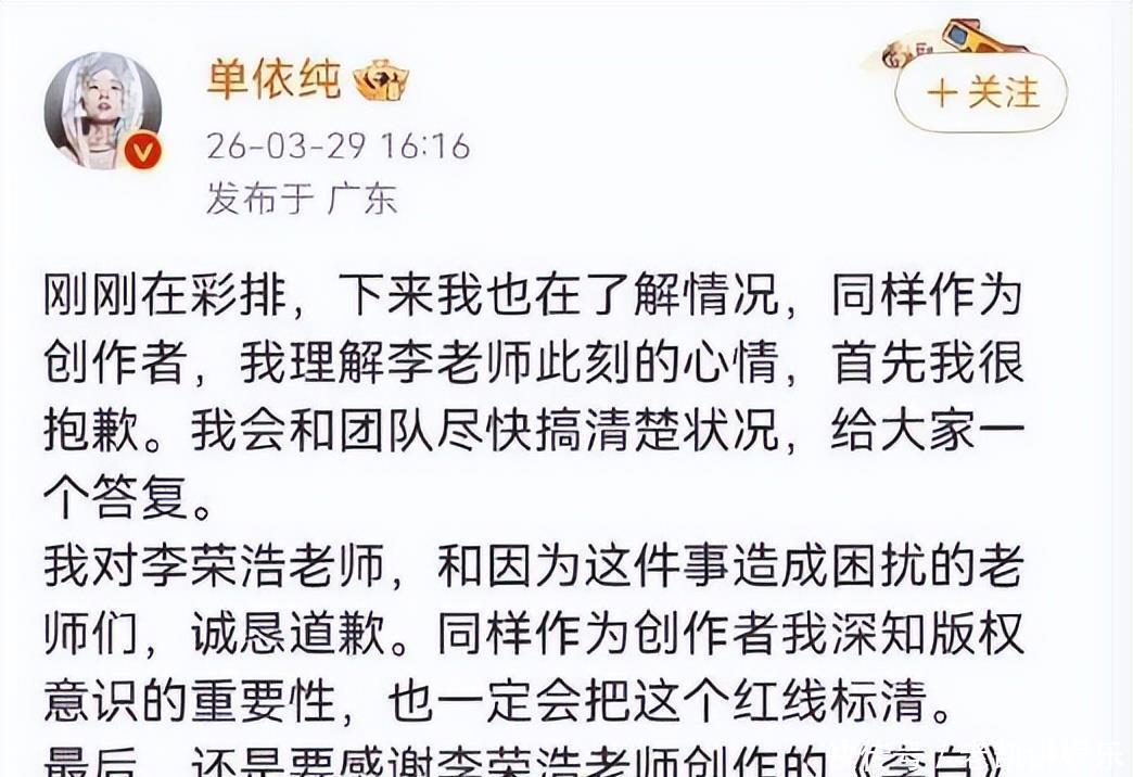 此次争议的缘故在于荣达代歌手单依纯的深圳贸易演唱会。她的团队预先向李荣浩方面请求演唱《李白》,却被径直拒却了。