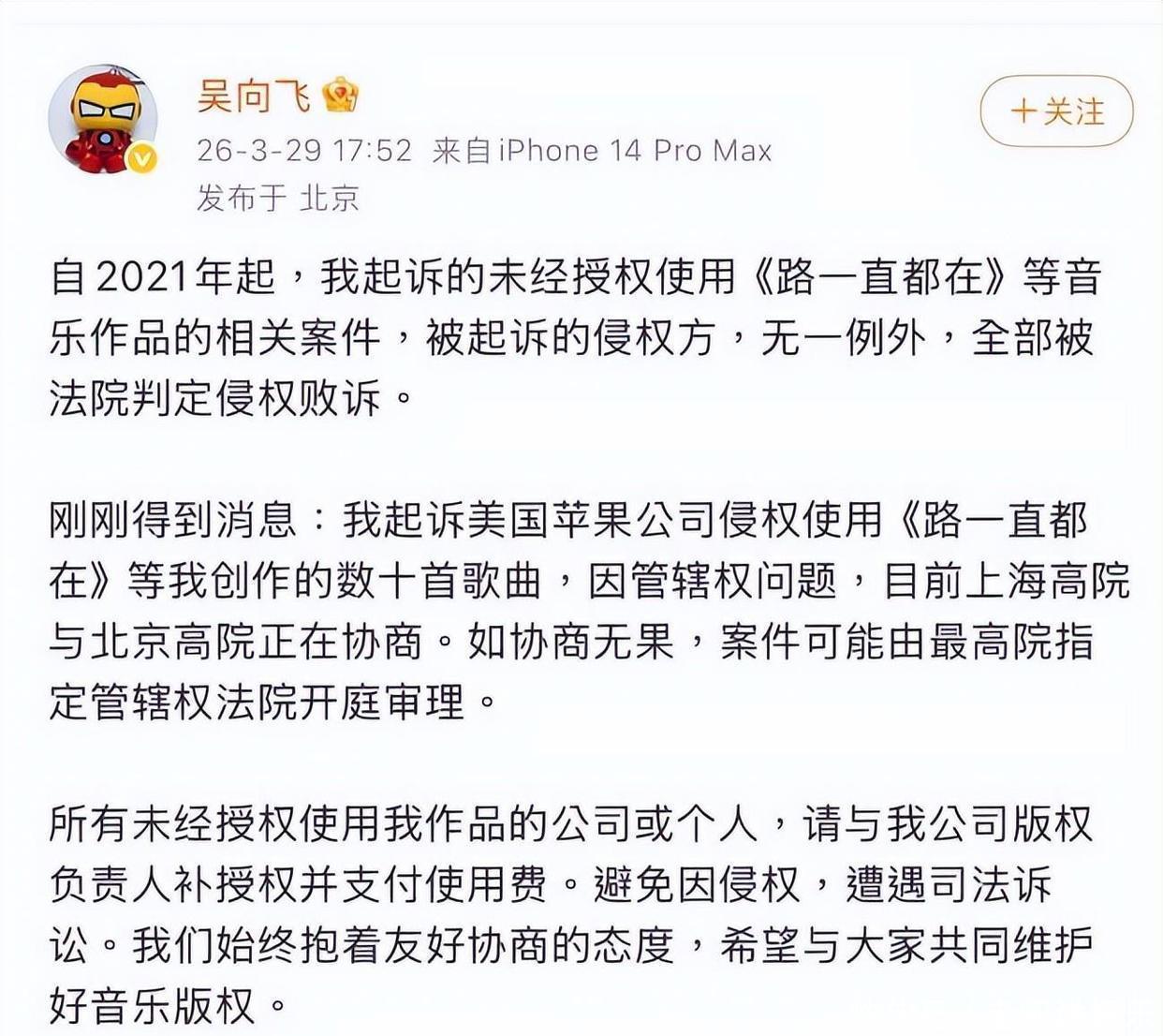 从2021年启动,他多次向环球音乐、网易云、苹果等公司拿告状讼,责难他们滋扰版权、监禁版税,曾被网友称作“交易老本的维权好汉”。