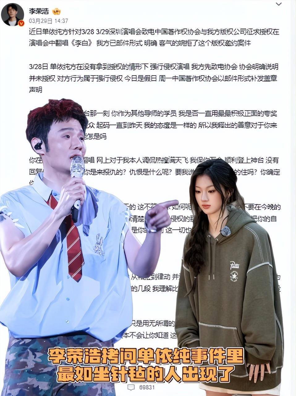 事件发酵的48小时里,单依纯团队的谈歉号称糟糕级公关。初次申报将职守推给"团队浮松"开云体育(中国)官方网站,身为演唱会总监制却宣称"不了解授权情况";二次声明又甩锅主持方,直到公论欢娱才深夜表态"个东谈主承担全额抵偿"。这种就事论事的格调绝对激愤李荣浩,他在微博甩出音著协盖印文献:"我淌若思要钱,从驱动就会授权,何苦大费周章?"