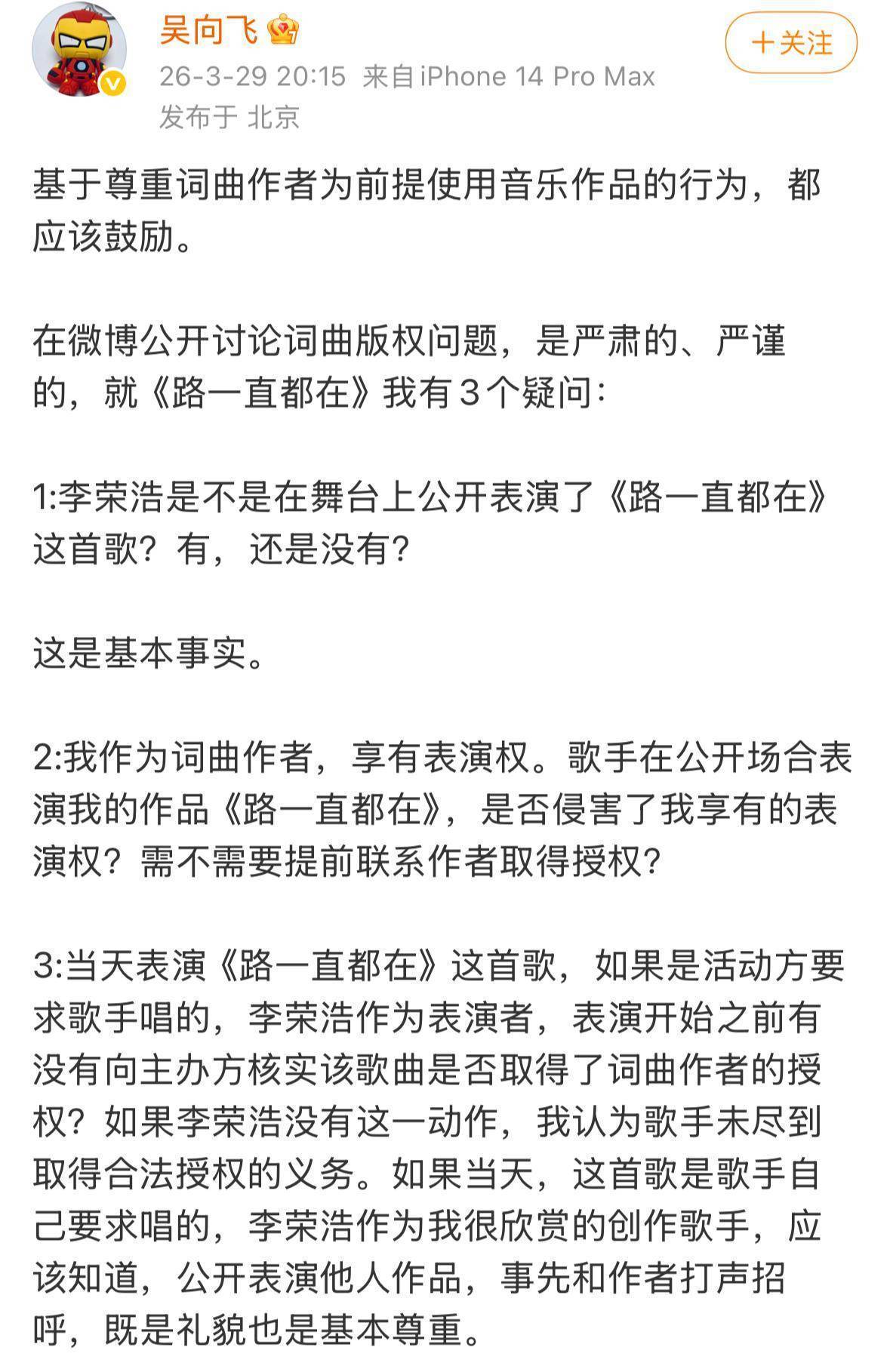 单依纯团队的响应倒是赶紧。3月29日下昼谈歉称“基于对相助方信任未核实授权”,晚上又发长文同意“个东谈主承担全额补偿”。但歌迷不买账:“谈歉灵验要法律干嘛?”更讽刺的是,操纵方致歉信里一句“经由放浪”,被网友扒出早在2025年《歌手2025》节目中,单依纯就因改编《李白》被李荣浩团队停止授权,