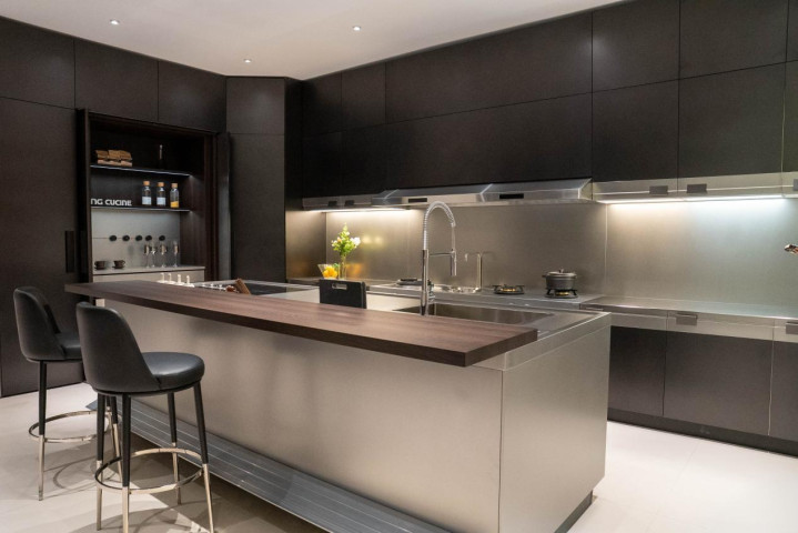 这次展会上,SENG CUCINE圣吉尼专注于不锈钢材质在高定家居畛域的深度应用与篡改,以意式极简为策画灵魂,将“灵感厨房生涯玄学”融入全屋六大空间系统,通过策画好意思学、柜电一体、极致工艺的深度交融,让不锈钢家居从功能材料真的走进品性生涯,为追求高品性生涯的高净值东说念主群,带来了兼具健康、耐用与艺术感的理思生涯提案。 1. 曜境:意式骨,登第魂,重构登第宴请新体验 “曜境”系列中厨,以意式极简见识为形态骨架,以登第宴请的烹调需求为内核,罢了冷感材质与暖感生涯的均衡。门板汲取克制的黑钛金属与金属原色组合,搭配自研的安祥手感拉手,极具异日感。功能上,通过自研超宽烈火灶、超宽烟机与超等烤箱的镶嵌式一体化策画,让登第爆炒、蒸煮变得高效而浅薄。额外策画的荫藏式水吧柜,B体育当作无火备餐区,与中厨中枢区变成灵验互补,让烹篡改线更通顺,空间诓骗更高效。