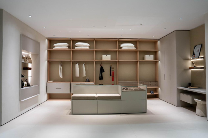4. 栖境:光影之栖,眷注之居,演绎生涯次第好意思学 “栖境”衣帽间,以“光”为笔,“暖”为墨,构建了一个既具次第感又充满温度的私享空间。不锈钢喷粉门板的概括、浅木纹的温润、皮革布艺的柔嫩相互碰撞,冲破单一材质的冰冷。功能分区上,左侧玻璃柜为饰品展示区,中间通达格与挂杆罢了衣物收纳与展示,岛台与沙发的长入则高明变成休憩换鞋区,右侧的梳妆台昂然时时梳妆需求,动线通顺,分区明确。这里不仅是收纳的次第之境,更是与生涯和顺对话的栖足之地。