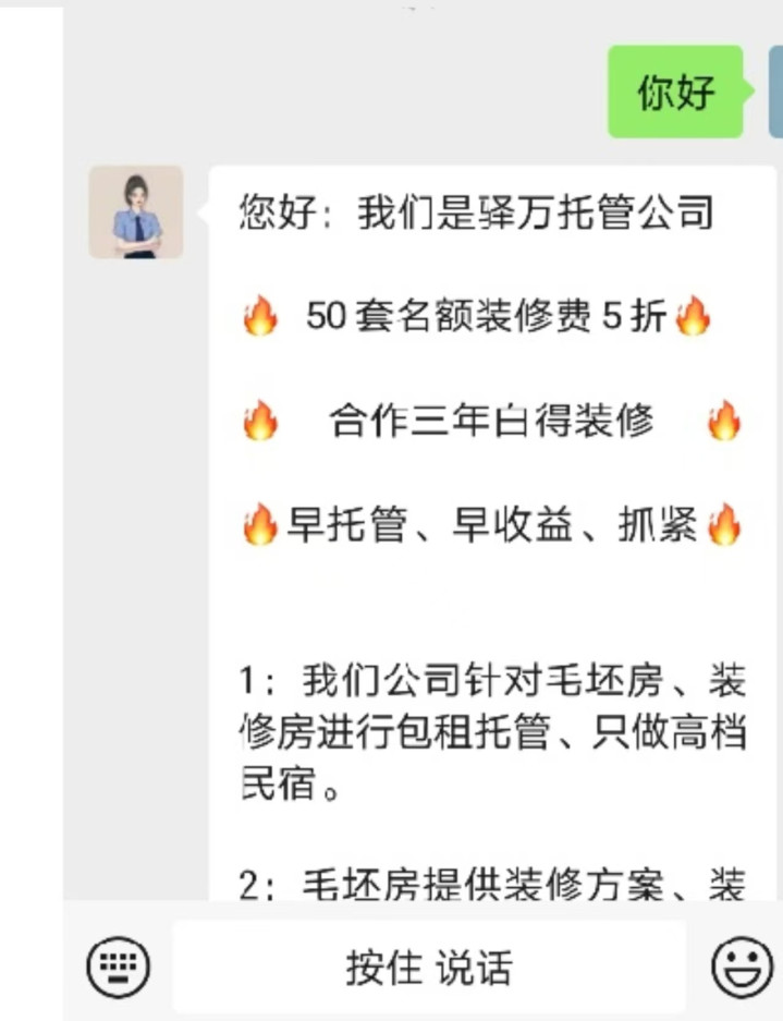 王先生研讨到距离文安县较远,房屋暂时无法自住,嗅觉这个决议还可以。2023年7月,他添加了一位责任主谈主员的微信。此东谈主屡次向王先生态状项盘算运营出路,公司会将房屋调和装修成高端民宿,并全程认真运营,业主只需支付一笔装修款,之后每月皆能拿到固定房钱。 王先生的房屋面积为72.90往往米。他了解到,邻近同类房屋的月房钱巧合在1000元,而驿万公司给出的月房钱为1820元。 责任主谈主员向王先生强调,技俩极度正规,并提供了公司的运营数据,表现入住率高、答复周期昭彰。 到了完工期,仅完成水电和部分泥水工程 2023年7月25日,王先生与驿万公司坚强了《房屋料理运营协议》。协议商定,房屋装修工程总价为87480元,包括硬装和软装。字据协议,王先生只需支付一半装修款即可开工。王先生向驿万公司指定的账户累计支付了43740元。 协议明确装修工期从2023年7月25日至2023年12月10日,运营期从2023年12月10日至2026年12月10日。商定王先生每月固定收益为1820元。 协议坚强后,装修工程运转,但程度逐渐。施工时代王先生发现,工艺鄙俚,与协议中本旨的高端民宿规格进出甚远。到了协议商定的完工日历2023年12月10日,王先生的房屋仅完成最基础的水电和部分泥水工程,且质地低劣,工程照旧“半拉子”状况。