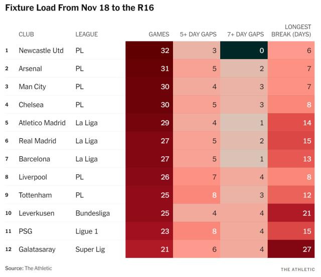 误解四:“内讧”纯借口?跑得最多最猛,比赛最多最累,是事实。 头些年,赶上英超吃瘪,英国东说念主以及天下各地确信英超优厚论的东说念主,会摆出这档次由:英超里面竞争强烈,赛程职责更重,因此,英超朱门深受内讧之苦,影响了在欧冠赛场的竞争力。 用这档次由讲明一切,极其穷乏劝服力。在本年的大灾眼前,尤其如斯。只不外,齐备否定这个身分,和全拿这档次由说事,雷同很不科学。 英超球队莫得冬休,比赛数目更多,是事实。竞技网一周前的数据泄漏,本季五大联赛,比赛数目前4名,被纽卡斯尔联、阿森纳、曼城、切尔西这4支英超球队包揽。本周一组新数据,则揭示了从11月国际比赛周密欧冠16强之间的更明显对比。上述英超4队最多打了32场比赛,皇萨则唯有27场。