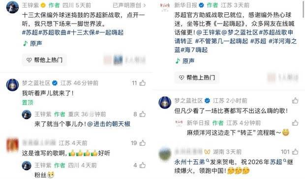 战歌火出圈后,梦之蓝社区飞速赶去音乐东谈主王锌紫转发的《一皆嗨起》辩驳区“报到”:“我听着声儿就来了。”王锌紫速即阴寒回话:“来了就当个事儿办。”这波互动,胜利把“战歌联动”的期待值拉满。 与此同期,新华日报也发布了“苏超”战歌有关视频,梦之蓝社区又准时打卡:“凡是少看一场比赛都写不出这样嗨的歌。”对此,新华日报俏皮回复:“困难洋河这边‘转正’经过哦”,既笃定了战歌的热度,又和洋河玩起了联动,片刻引爆辩驳区。