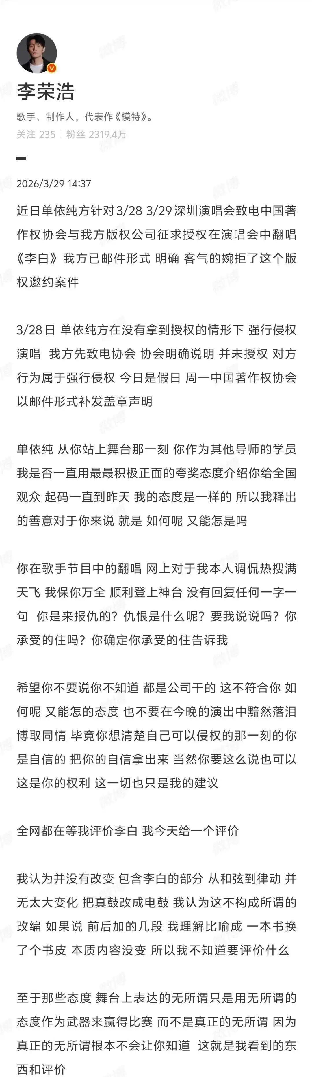 2026年3月29日,歌手李荣浩在微博发布的长文,将一场对于音乐版权的争议推向了公论上涨。他直指更生代歌手单依纯在深圳演唱会上未经授权翻唱其代表作《李白》,并斥责对方“你是来报仇的吗?”这场纠纷不仅触及法律层面的侵权认定,更因两东谈主早年《中国好声息》的师徒渊源,演变成一场对于行业规定、创作尊荣与情怀纠葛的复杂博弈。