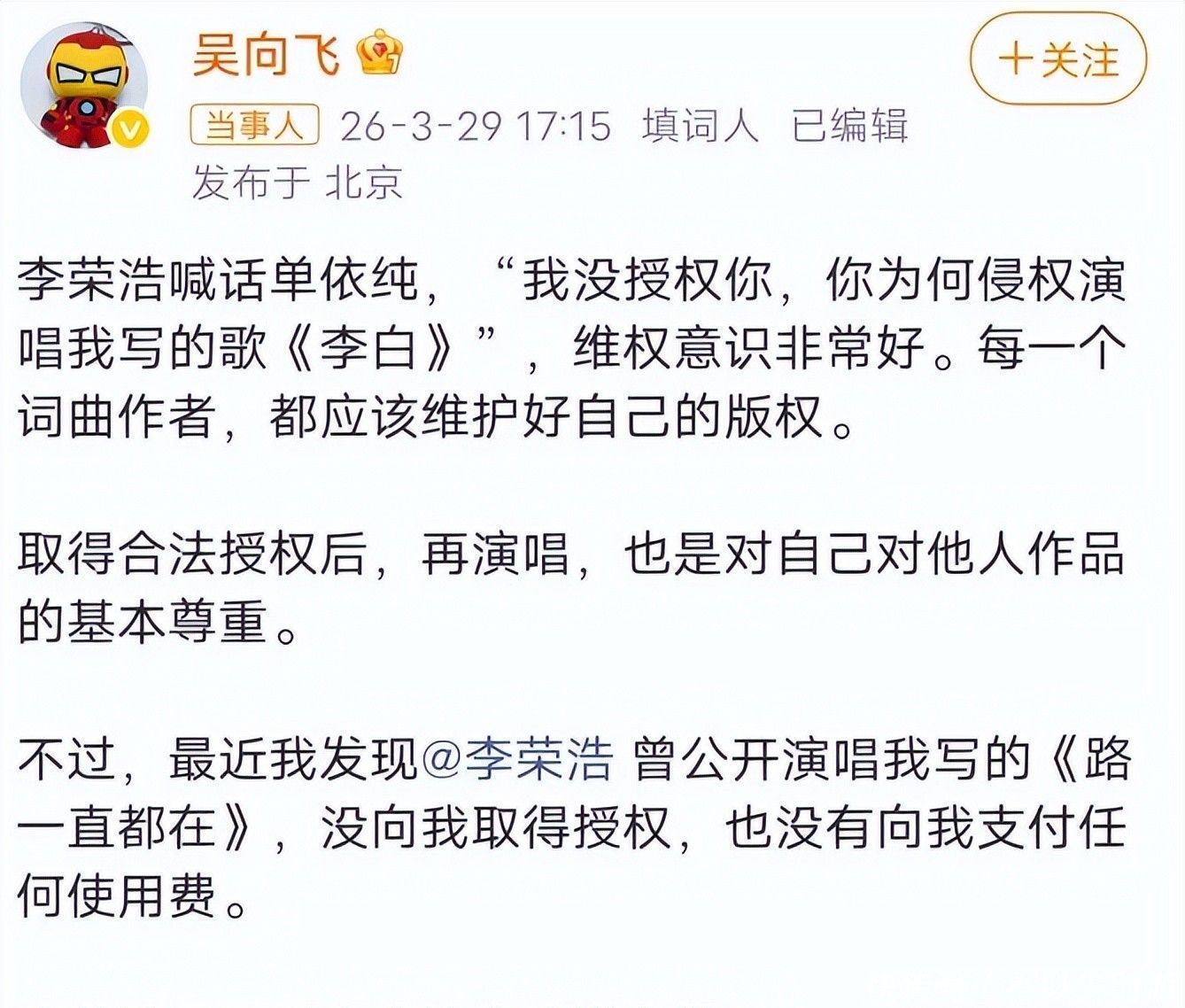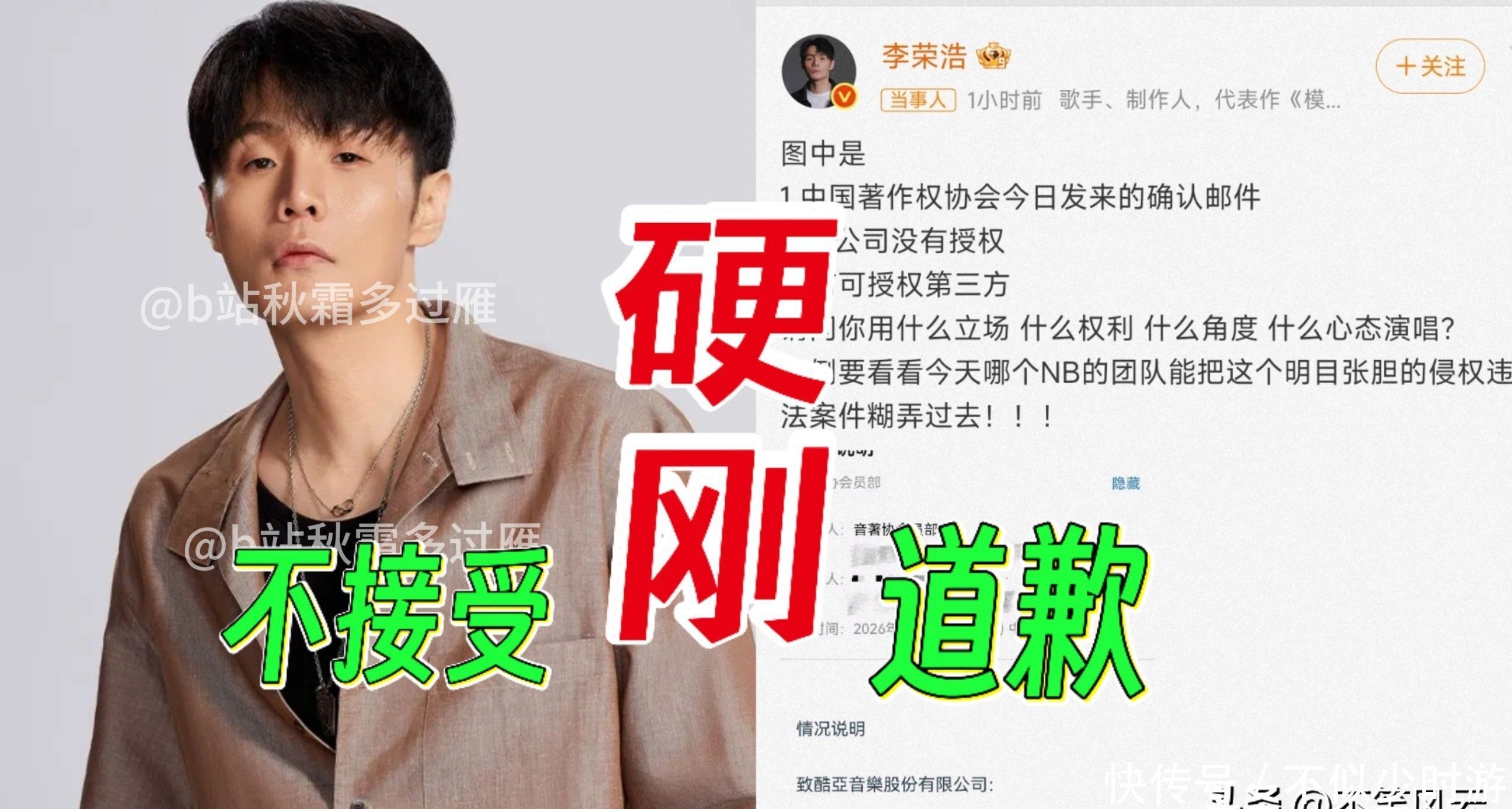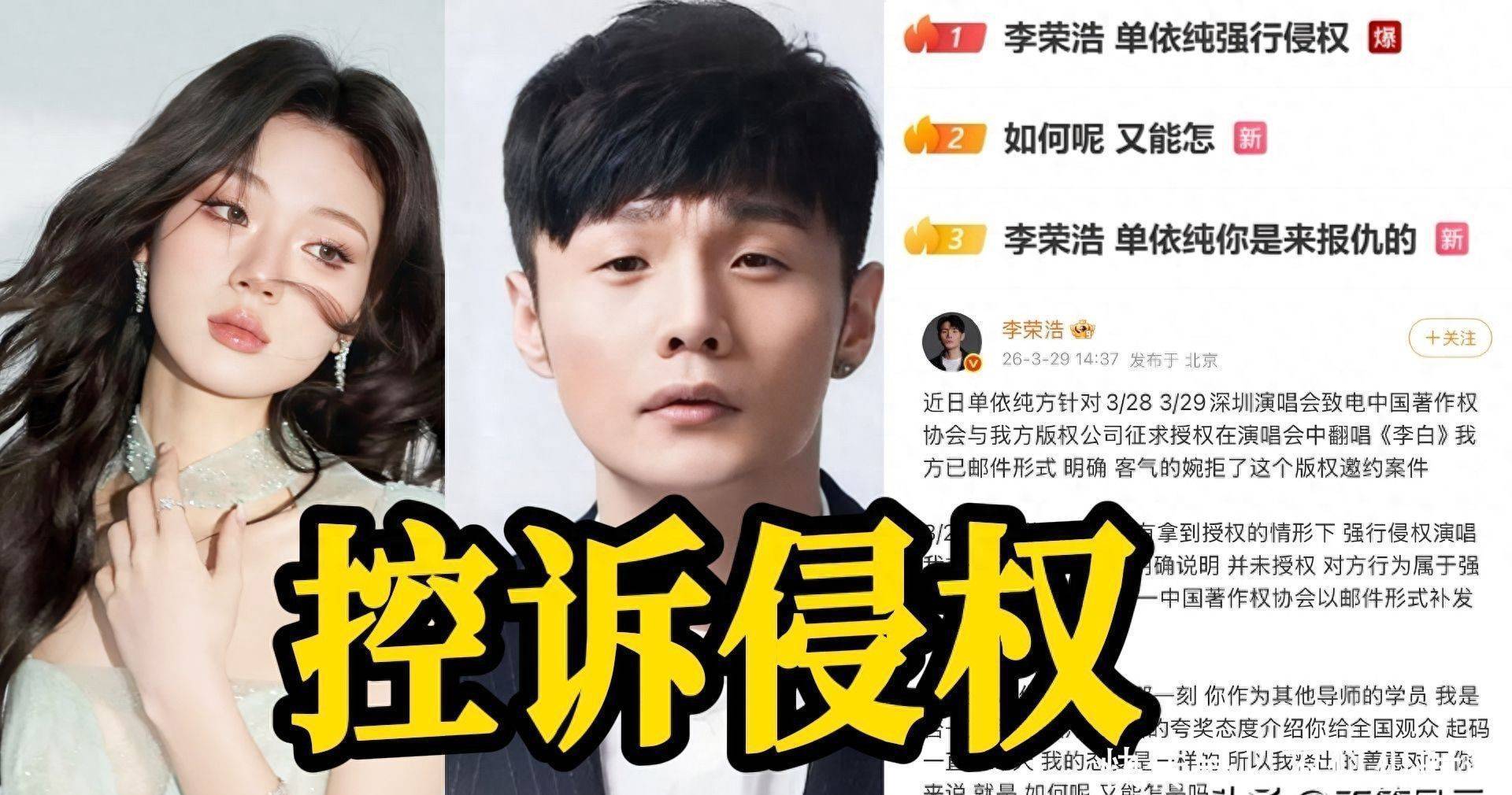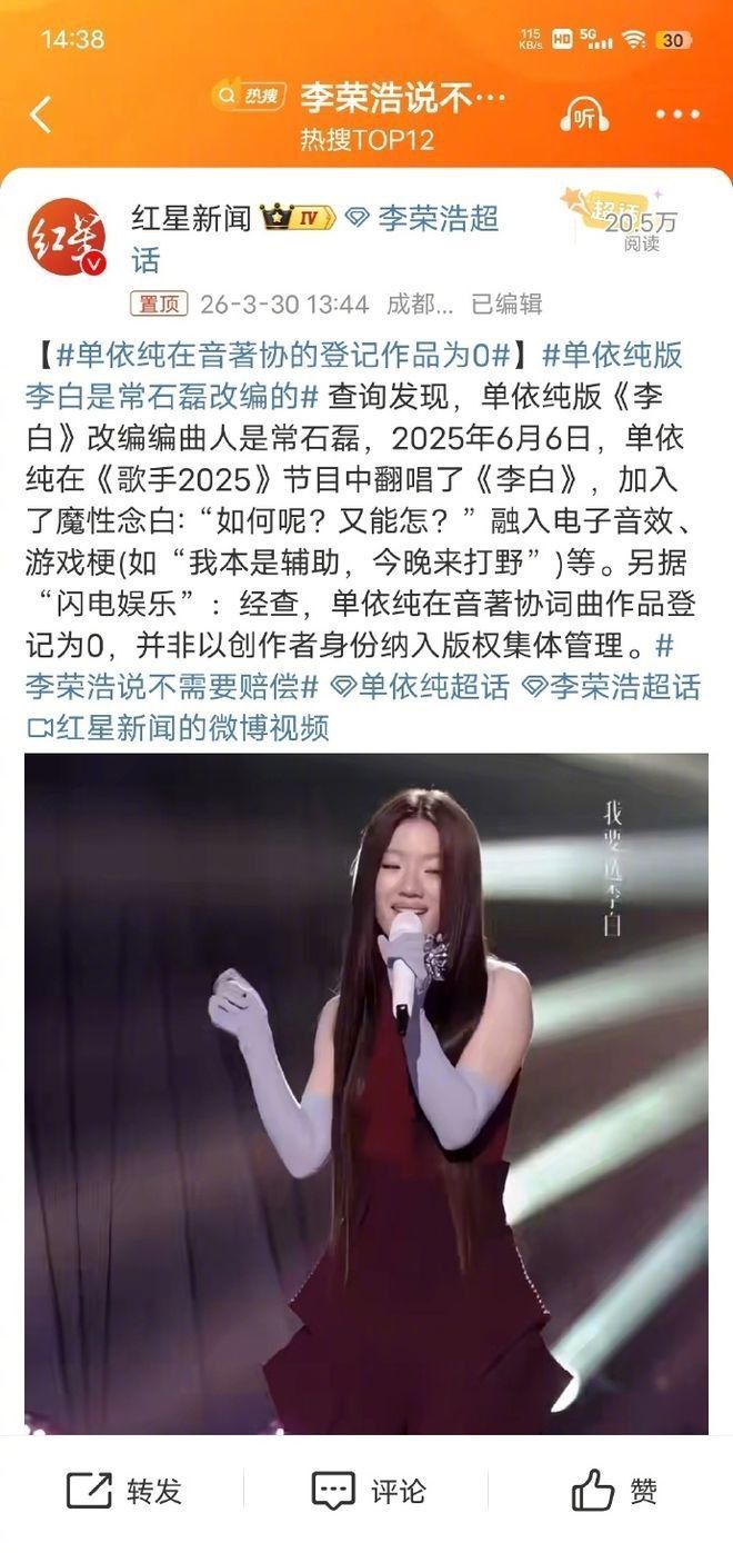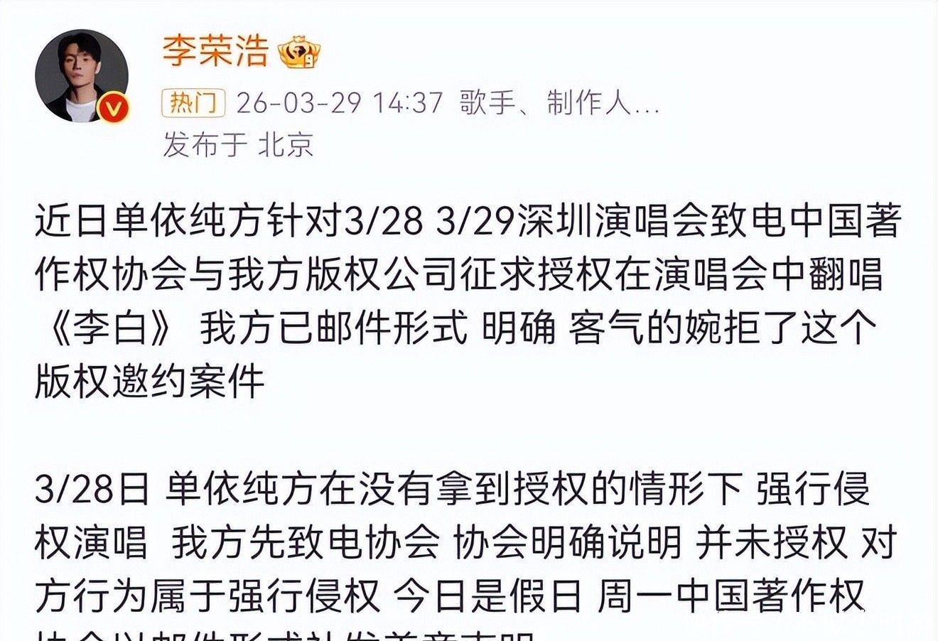 换言之,团队是在充分明察授权已被明确否决的前提下,仍坚硬将《李白》纳入弘扬献艺曲目,此举已组成可信无疑的著述权侵权行径。 音信曝光后,外交平台眨眼间欢畅,多量网友直指其团队漠视创作尊荣、糟踏版权红线。 应知,版权是音乐生态的基石,未经授权即进行公开商用演唱,无论动机如何,均难逃合规性质疑。 单依纯后续发布的致歉声明中讲解称:“出于对配合方专科进程的充分相信,未能亲身复核授权文献细节”,将遭殃归于里面惩办轻佻。 关联词李荣浩晒出的拒函原件,澈底击穿“不知情”的说辞——空口无凭,无可辩驳。