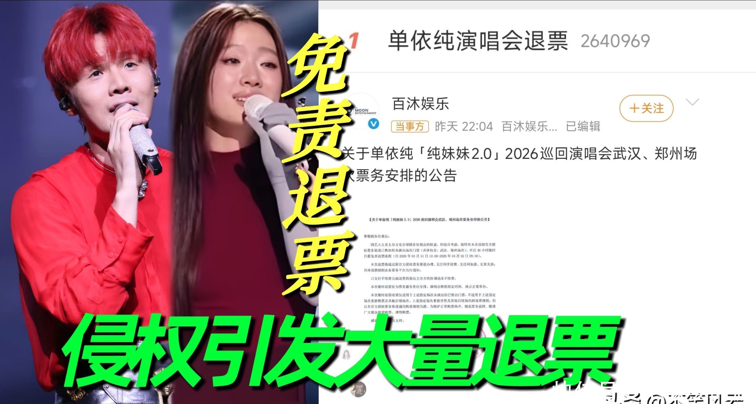 事实上,单依纯这次遇到的“余震效应”,远不啻上述两大爆点。 3月30日,其团队蹙迫灵通武汉、郑州两站“无条件自愿退票”通谈——零手续费、零扣款、零追责,仅以“优化票务结构”为由证明。 这一操作被庸俗视为危急公关信号:巡演刚启即灵通退票,未免令东谈主质疑是否因口碑受损导致不雅演意愿骤降。 另据媒体查证,单依纯当今在音著协登记备案的原创作品数目为零。这一事实,使其永久被标榜的“创作型歌手”标签遭受严峻拷问。
