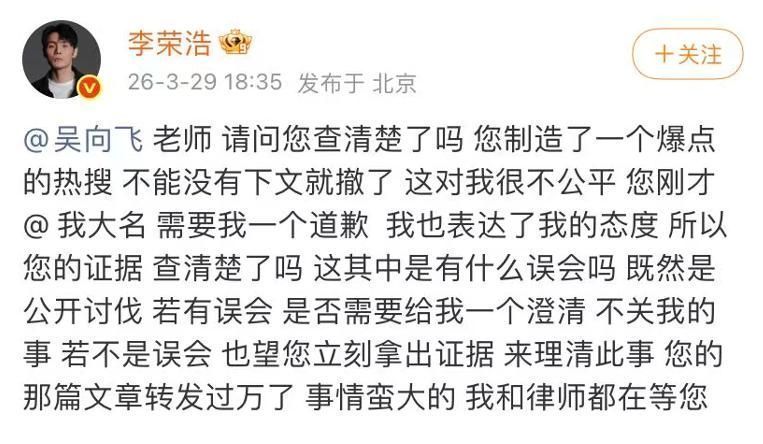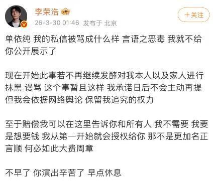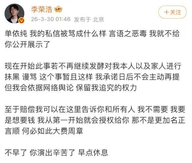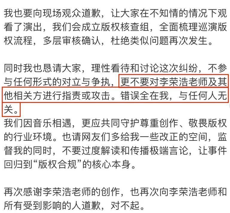文中明确示意:“一齐背负在我一东说念主,与他东说念主无关”,并恳请公众罢手对李荣浩的言语攻击。