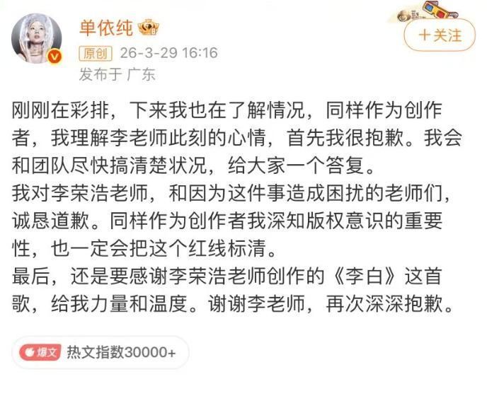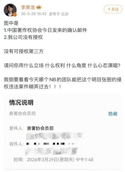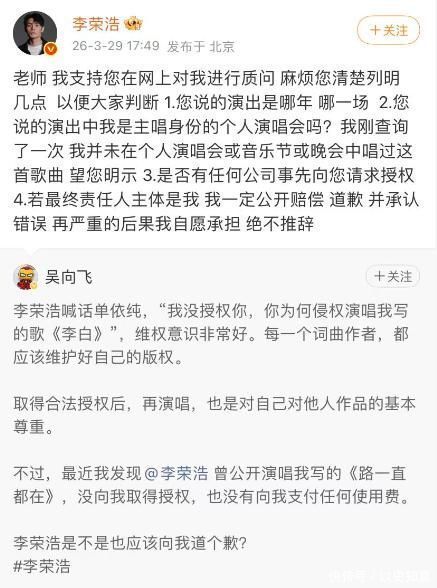 3月29日,李荣浩通过个东说念主微博发布严正声明,直指其未经授权私行改编并公开演唱《李白》,组成事实性侵权行为。