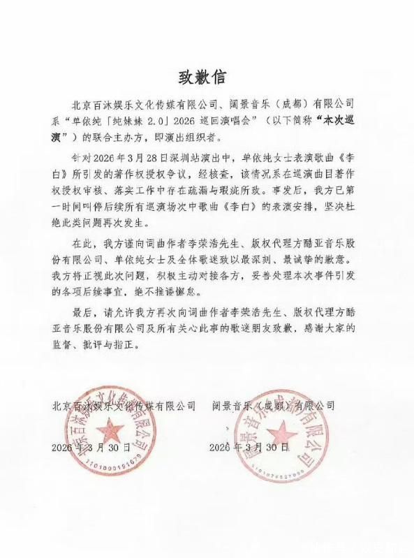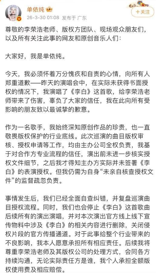 而这一次,她在版权红线眼前,迈出了不该迈出的一步。 3月30日凌晨,单依纯发布千字长文致歉,立场愈发诚恳真挚。
