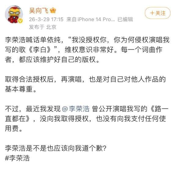 颇具戏剧性的是,在李荣浩发起维权的并吞日,另一桩版权争议同步浮出水面。 词作家吴向飞顿然公设备声。 他明确指出,李荣浩曾在某次大型公开上演中未经许可演唱其原创作品《路一直王人在》,并要求对方正式致歉。