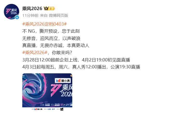 全网蹲守的重磅讯息终于来了!万众期待的女性励志成长音乐竞演综艺《乘风2026》追究官宣定档,将于四月初登陆芒果TV与湖南卫视双平台同步播出,全网追综形态行将开启,讯息一出胜利霸榜热搜,网友们片刻欢娱:“终于比及了!这季姐姐声势也太绝了!”
